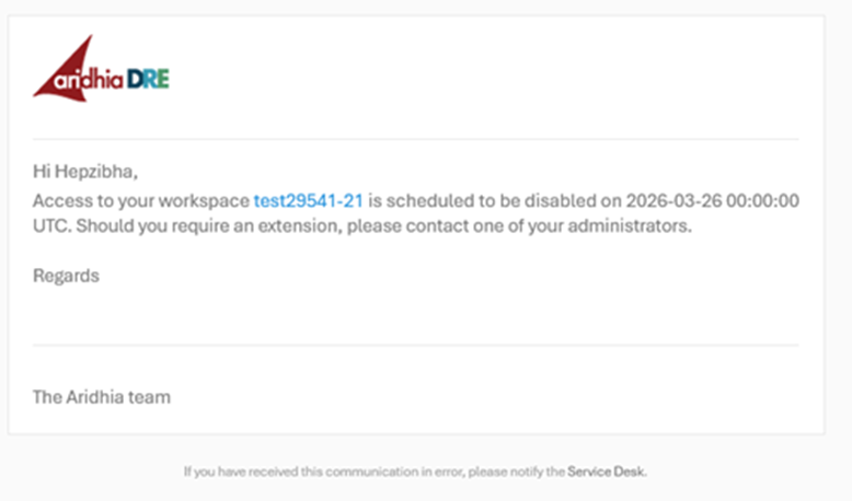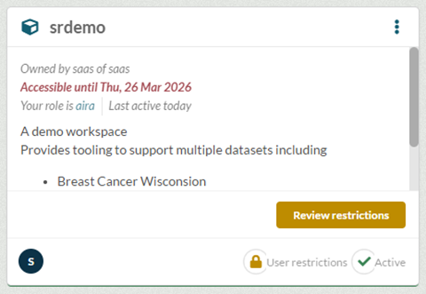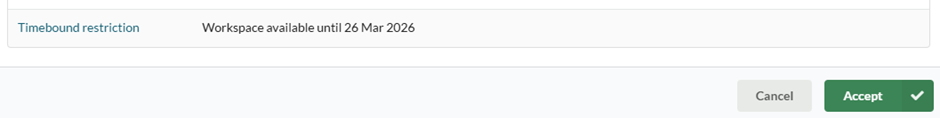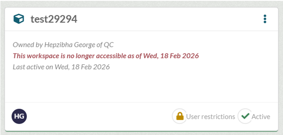 When a time restriction is placed on your workspace, the workspace card will indicate this clearly. The following shows a workspace that has access until 26th March 2026.