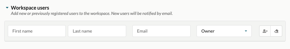 From the workspace Add/Edit view, the TA should simply add the new user in the workspace users section. The TA can add the name and email of a new user and add them to the workspace user list and assign a role.