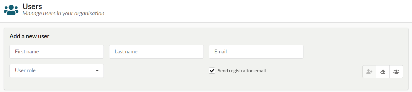 The TA needs to fill out the first and last names of the new user as well as their email address. The TA can also use the 'Send registration email' checkbox to choose whether to send the user an email to prompt them to register – the TA may choose not to send the email if they are going to set up a workspace with the user shortly. The user will be sent an email when they are added to the workspace so the TA can limit the number of emails the user is sent by using the checkbox.