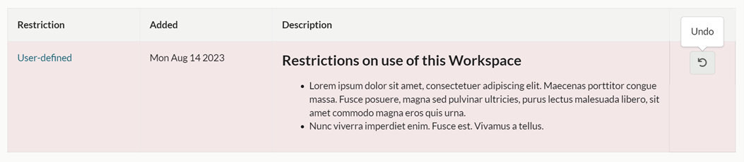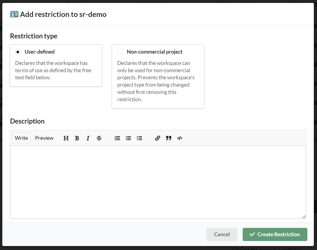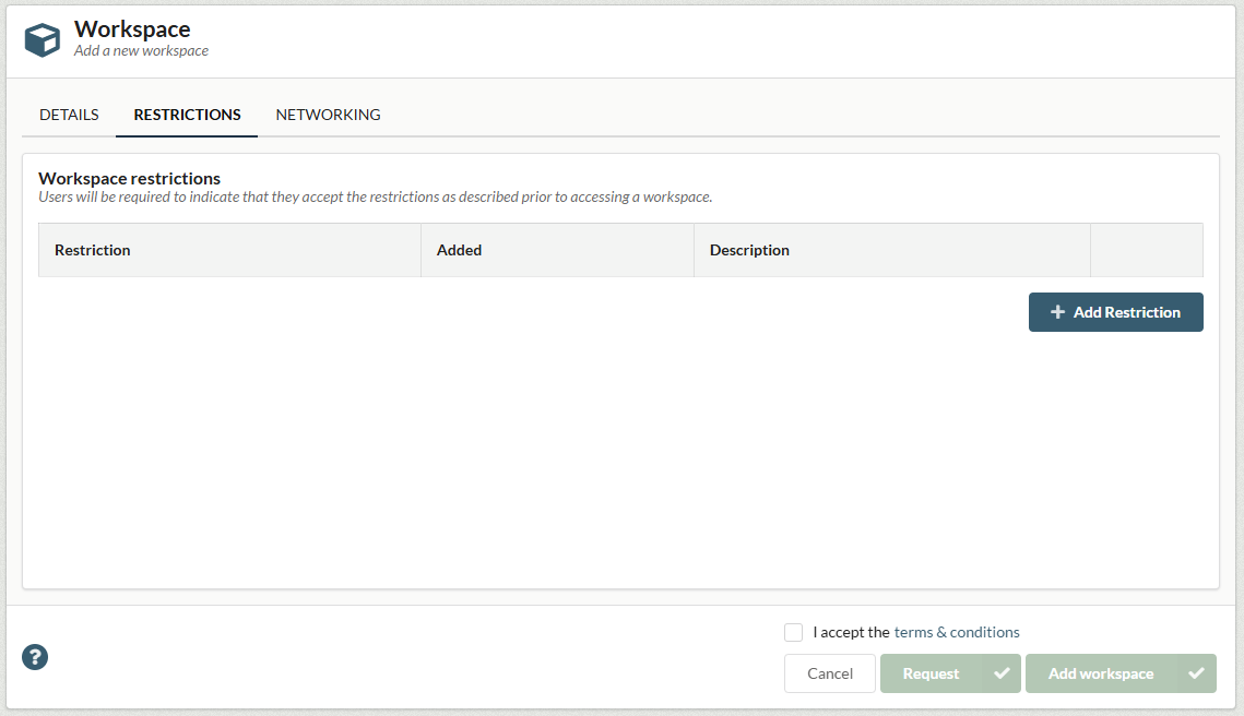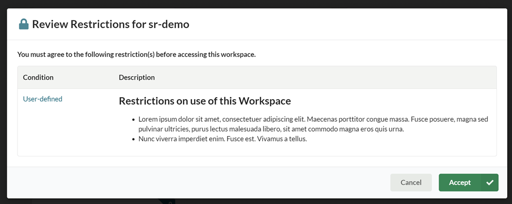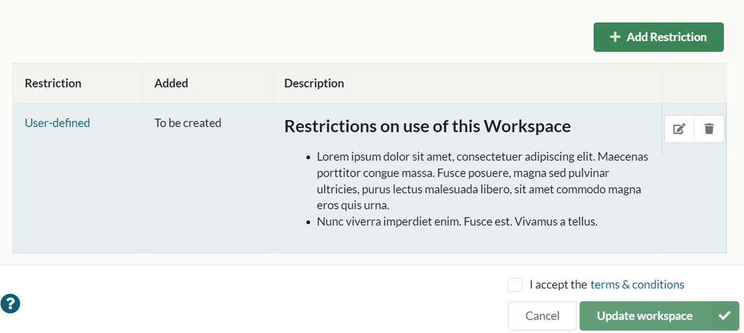 Restrictions are statements or documents that a user of a workspace must agree to prior to being granted access to the workspace. They can be applied by the Tenant Administrator (TA), Workspace Owner or Workspace Administrator at any time, and can be used to record the acceptance of Data Use Agreements or Data Use Conditions that restrict the researcher in some way. For example, the data can only be used for non-commercial purposes, or a particular citation is required for any publications created as a result of working with the data.