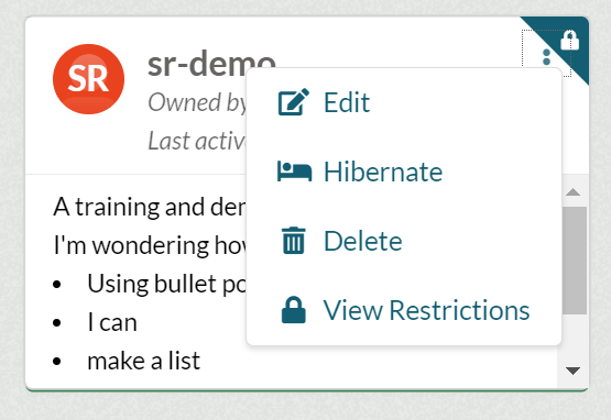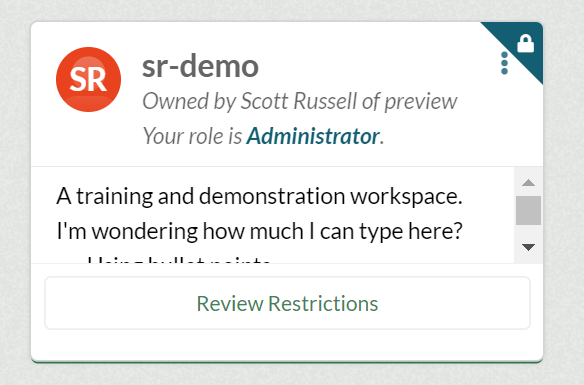 Administrators and workspace members view the applied restrictions using the View Restrictions menu item on the workspace card.