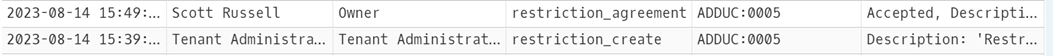 All restriction events are audited: creation, deletion, and acceptance. Restriction acceptance is audited at the time of acceptance against the workspace audit log. The following shows audit entries for the creation of a restriction and the acceptance of the same restriction by a workspace user.