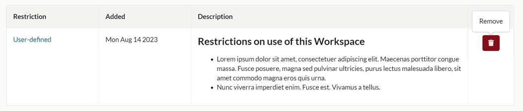 To delete a restriction, open the Edit workspace page and select the Remove icon.
