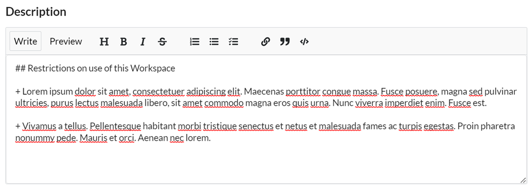 Type the description of the restriction into the text field. You can use the icon controls for formatting or enter text using the Markdown format. When using Markdown, the Preview button can be used to show how that entry will be presented.