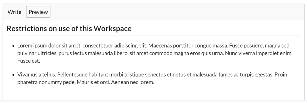 User-defined is the default restriction type. It allows the administrator to enter free form text using the text editor to specify the restrictions that the user will need to agree to before access to a workspace is granted.