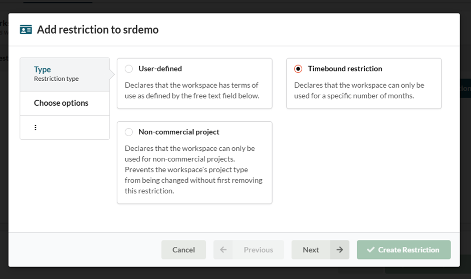 Timebound Restrictions allow access to a workspace to be controlled and limited for a duration of time. Administrators can select end date using a calendar and workspace users will not be able to enter the workspace once this end date has passed.