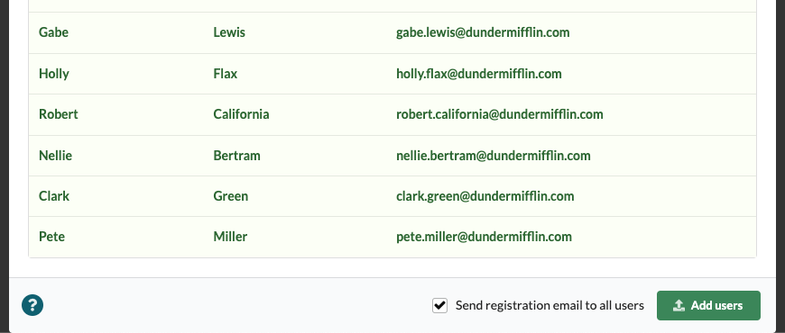 If the user data is all valid, every row will be coloured green, and the TA can click the 'Add users' button in the footer of the modal. A message of Users added successfully should be displayed.