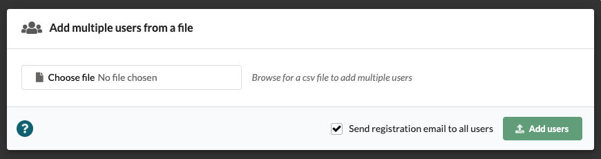 The modal has a 'Choose file' button and an 'Add users' button in the footer of the modal, as well as a checkbox to send registration emails to all users that will be uploaded.