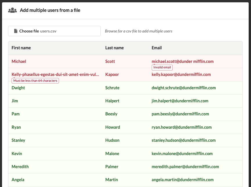 If there are any further problems (for example, if a user has been added by a different TA at the same time) a table with only the users that failed the server validation will be displayed. The TA can correct the file as before – the previous users data will be overwritten by the new data.
