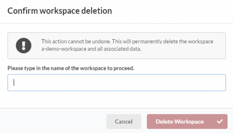 You will be presented with a dialogue box. To avoid accidental deletion of a workspace, you must enter the full workspace name to confirm and then click Delete. (Note, it will take some time for the workspace to be deleted, so it might still appear on your list for a while.)
