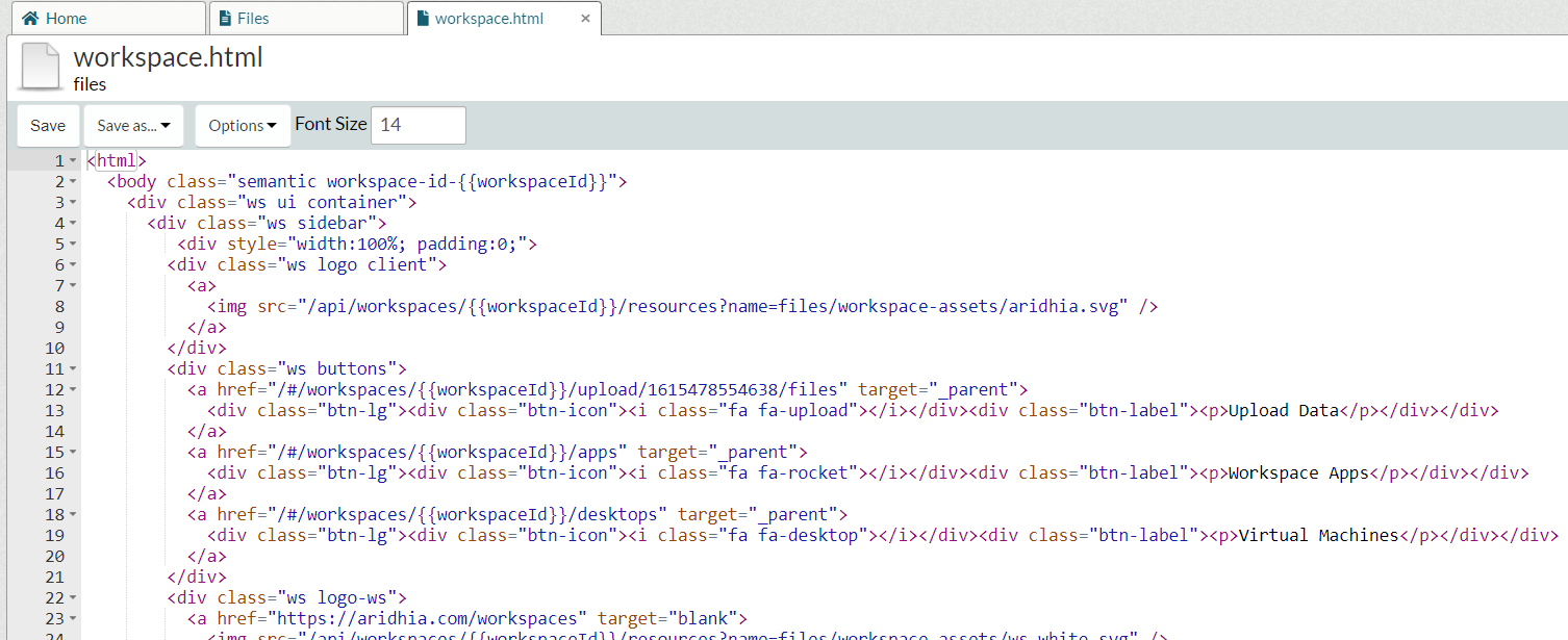 To replace the default homepage for a custom homepage in a workspace, download this HTML template, unzip it and upload the workspace.html file to your Files folder. Now you should be able to edit and add your project description, images, and useful links. The template has default workspace styling applied, it also includes some examples on how to structure your text, add images and links.