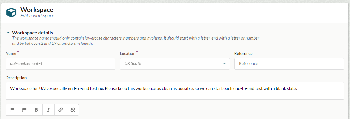 This should open the Edit workspace screen, where you can edit the workspace description. At the bottom left of the text box, you have the option to use text formatting tools to make the text bold or italic, turn on automatic bullets or numbering, and create a hyperlink.