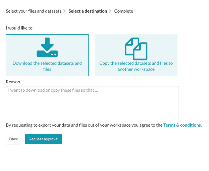 In the Select a destination step, choose the 'Copy the selected datasets and files to another workspace' option. A dropdown will appear with a list of workspaces that you are a member of. It will also include workspaces where you have a Contributor role. Simply select that target workspace and create a request.