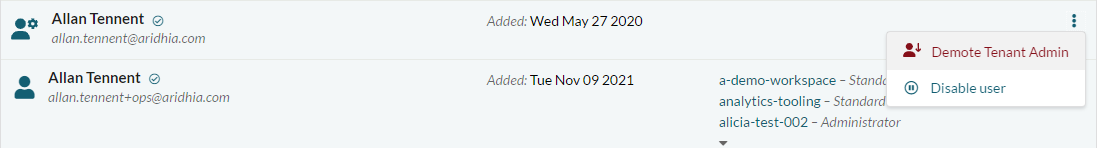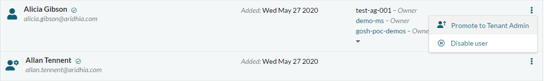 From the user management list, a TA can use the 'Promote to Tenant Admin' action to upgrade another user to TA. A pop-out will be shown to confirm the action.