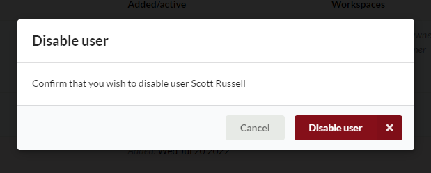 Note: If a user is an owner of any workspaces, they cannot be disabled until ownership of those workspaces has been removed. A pop-up prompt will inform the TA of the number of workspaces that user is an owner of. Ownership is transferred or removed using the individual workspace management UI.