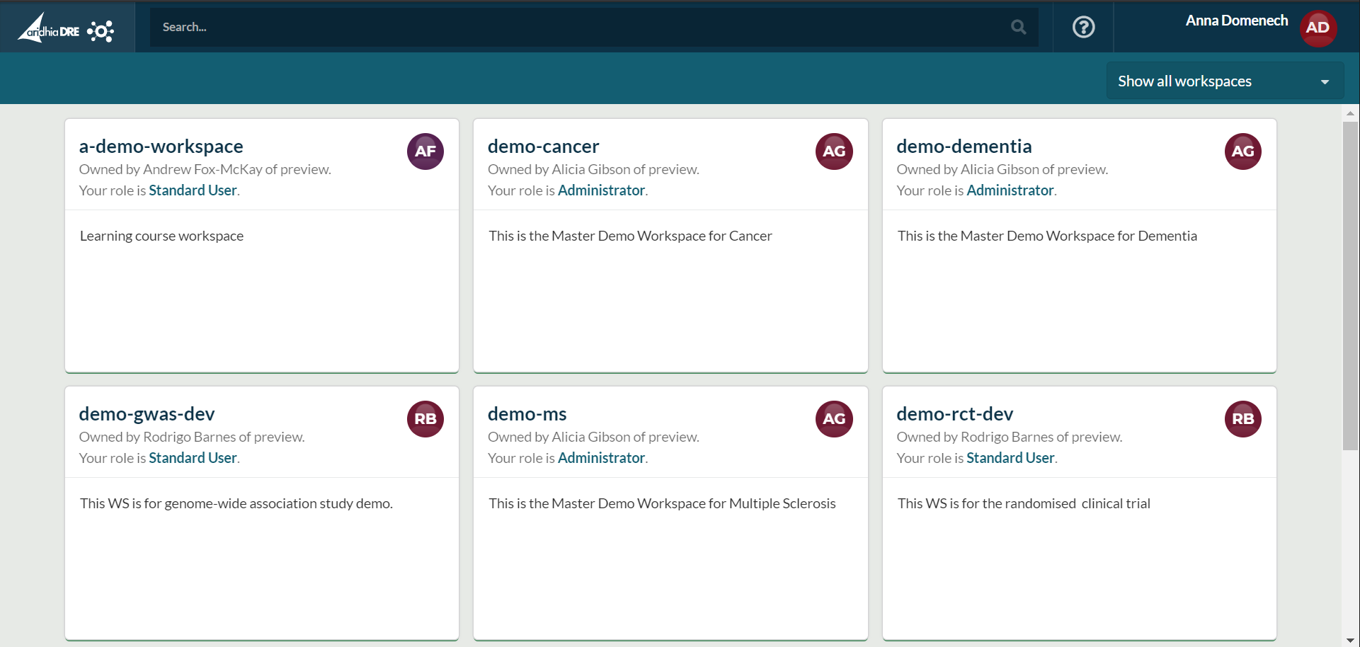 You may have heard of the concept of a trusted research environment, or TRE. Workspaces fulfils the requirements and purpose of a TRE within Aridhia's wider DRE ecosystem. Workspaces are hosted private collaborative analytic environments within the platform, which a distributed team can access through both their web browser and virtual machine environments (where applicable). Workspaces provide a model for teams that may align to projects, programmes, or working groups from one or more organisations or departments.